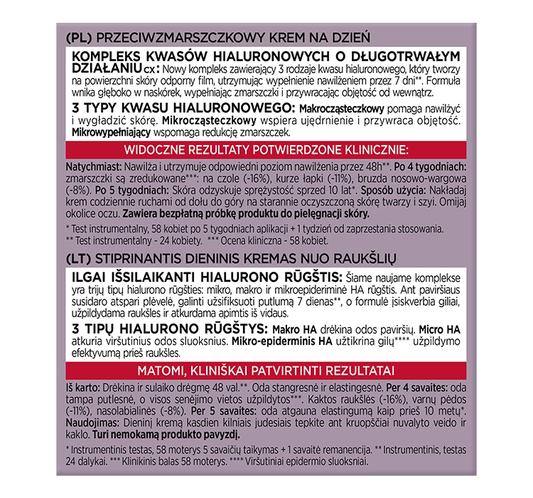Die Hyaluronsäure ist eine natürliche Substanz, die von unserem Körper produziert wird und die Haut mit Feuchtigkeit versogt, um die Elastizität zu erhalten. Im Laufe des Hautalterungsprozesses nimmt der Hyaluronsäuregehalt jedoch ab, wodurch die Spannkraft unserer Haut nachlässt und Falten entstehen. Die Tagescrenme enthält die höchste Konzentration an Hyaluronsäure und sorgt damit für einen optimalen Aufpolsterungseffekt. Die Creme spendet 48 Stunden Feuchtigkeit und nach nur 8 Wochen*, polstert die Wangen sowie Stirn- und Nasolabialfalten sichtbar auf.