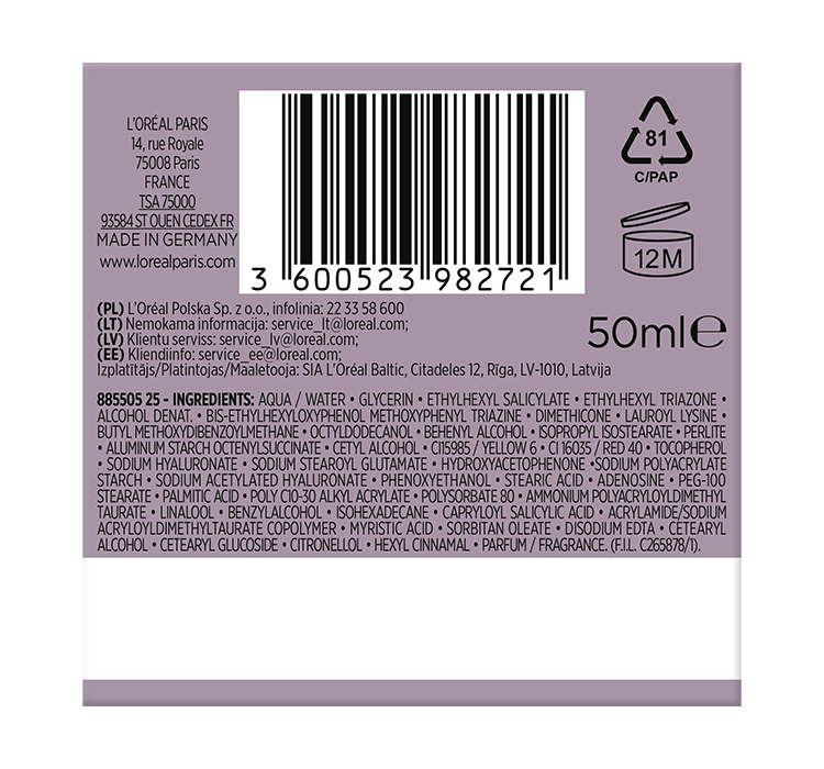 Ingredients: AQUA / WATER • GLYCERIN • ETHYLHEXYL SALICYLATE • ETHYLHEXYL TRIAZONE • ALCOHOL DENAT. • BIS-ETHYLHEXYLOXYPHENOL METHOXYPHENYL TRIAZINE • DIMETHICONE • LAUROYL LYSINE • BUTYL METHOXYDIBENZOYLMETHANE • OCTYLDODECANOL • BEHENYL ALCOHOL • ISOPROPYL ISOSTEARATE • PERLITE • ALUMINUM STARCH OCTENYLSUCCINATE • CETYL ALCOHOL • CI 15985 / YELLOW 6 • CI 16035 / RED 40 • TOCOPHEROL • SODIUM HYALURONATE • SODIUM STEAROYL GLUTAMATE • HYDROXYACETOPHENONE • SODIUM POLYACRYLATE STARCH • SODIUM ACETYLATED HYALURONATE • PHENOXYETHANOL • STEARIC ACID • ADENOSINE • PEG-100 STEARATE • PALMITIC ACID • POLY C10-30 ALKYL ACRYLATE • POLYSORBATE 80 • AMMONIUM POLYACRYLOYLDIMETHYL TAURATE • LINALOOL • BENZYL ALCOHOL • ISOHEXADECANE • CAPRYLOYL SALICYLIC ACID • ACRYLAMIDE/SODIUM ACRYLOYLDIMETHYLTAURATE COPOLYMER • MYRISTIC ACID • SORBITAN OLEATE • DISODIUM EDTA • CETEARYL ALCOHOL • CETEARYL GLUCOSIDE • CITRONELLOL • HEXYL CINNAMAL • PARFUM / FRAGRANCE (F.I.L. C265878/1).