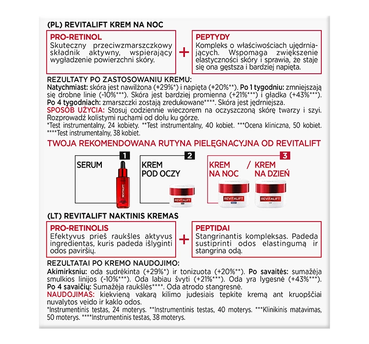 Die Nachtgesichtscreme L'Oréal Paris Revitalift wirkt vielseitig und bietet sowohl sofortige als auch langfristige Ergebnisse. Schon nach der ersten Anwendung erhält die Haut einen gesunden Glanz und wirkt straffer. Nach einer Woche wird sie deutlich fester, und ihre Struktur wird geglättet. Nach vier Wochen ist eine deutliche Reduzierung der Falten sichtbar – auf der Stirn, um die Augen und um den Mund herum.