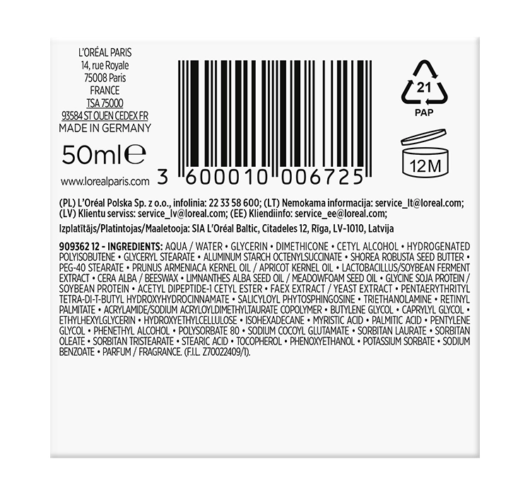 Ingredients: AQUA / WATER • GLYCERIN • DIMETHICONE • CETYL ALCOHOL • HYDROGENATED POLYISOBUTENE • GLYCERYL STEARATE • ALUMINUM STARCH OCTENYLSUCCINATE • SHOREA ROBUSTA SEED BUTTER • PEG-40 STEARATE • PRUNUS ARMENIACA KERNEL OIL / APRICOT KERNEL OIL • LACTOBACILLUS/SOYBEAN FERMENT EXTRACT • CERA ALBA / BEESWAX • LIMNANTHES ALBA SEED OIL / MEADOWFOAM SEED OIL • GLYCINE SOJA PROTEIN / SOYBEAN PROTEIN • ACETYL DIPEPTIDE-1 CETYL ESTER • FAEX EXTRACT / YEAST EXTRACT • PENTAERYTHRITYL TETRA-DI-T-BUTYL HYDROXYHYDROCINNAMATE • SALICYLOYL PHYTOSPHINGOSINE • TRIETHANOLAMINE • RETINYL PALMITATE • ACRYLAMIDE/SODIUM ACRYLOYLDIMETHYLTAURATE COPOLYMER • BUTYLENE GLYCOL • CAPRYLYL GLYCOL • ETHYLHEXYLGLYCERIN • HYDROXYETHYLCELLULOSE • ISOHEXADECANE • MYRISTIC ACID • PALMITIC ACID • PENTYLENE GLYCOL • PHENETHYL ALCOHOL • POLYSORBATE 80 • SODIUM COCOYL GLUTAMATE • SORBITAN LAURATE • SORBITAN OLEATE • SORBITAN TRISTEARATE • STEARIC ACID • TOCOPHEROL • PHENOXYETHANOL • POTASSIUM SORBATE • SODIUM BENZOATE • PARFUM / FRAGRANCE (F.I.L. Z70022409/1).