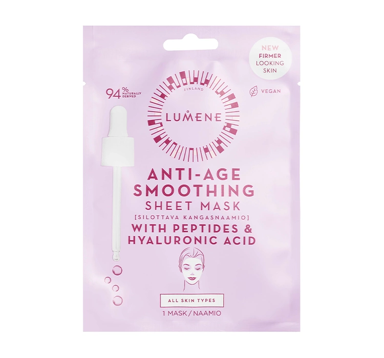 Die biologisch abbaubare Maske von Lumene, angereichert mit Peptiden und Hyaluronsäure, ist eine wahre Revolution in der täglichen Hautpflegeroutine. Die Basis der Maske ist ein Cellulose-Tuch, das perfekt auf das Gesicht aufliegt und eine effektive Wirkung der aktiven Inhaltsstoffe ermöglicht. Cellulose ist ein biologisch abbaubares Material, was bedeutet, dass die Maske umweltfreundlich ist. Darüber hinaus bildet das Tuch eine Schutzbarriere, die den Wasserverlust von der Haut verhindert, was entscheidend für die Aufrechterhaltung eines optimalen Feuchtigkeitsniveaus ist.Die Lumene Anti-Age Smoothing Sheet Mask wurde mit zwei wohltuenden Inhaltsstoffen angereichert, die das gesunde Aussehen der Haut unterstützen. Peptide, bekannt für ihre regenerierenden und verjüngenden Eigenschaften, stimulieren die Produktion von Kollagen und verbessern die Festigkeit und Elastizität der Haut. Hyaluronsäure ist ein äußerst effektiver Feuchtigkeitsspender, der hilft, Wasser in der Haut zu halten und eine tiefgehende Hydratation zu gewährleisten. Die Haut wird genährt, weich und strahlend.