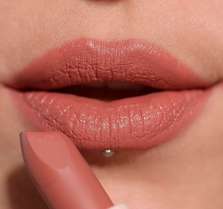 Trage den Lippenstift auf saubere und trockene Lippen auf, beginne in der Mitte und verteile ihn gleichmäßig nach außen.
