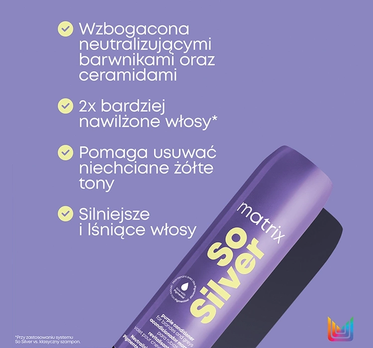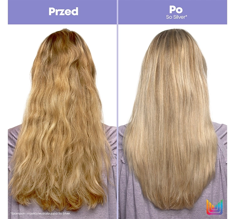 So Silver ist ein Conditioner, der sowohl graues als auch blondes Haar pflegt, ihm einen silbernen Farbton verleiht und unschöne Gelbfärbung entfernt. Das Produkt verleiht dem Haar eine kühle Tönung und einen glänzenden, gesunden Schimmer. Der Conditioner verlängert die Farbe des Haares nach dem Färben und enthält Vitamin E, ein starkes Antioxidans, das das Haar vor schädlichen äußeren Einflüssen schützt.