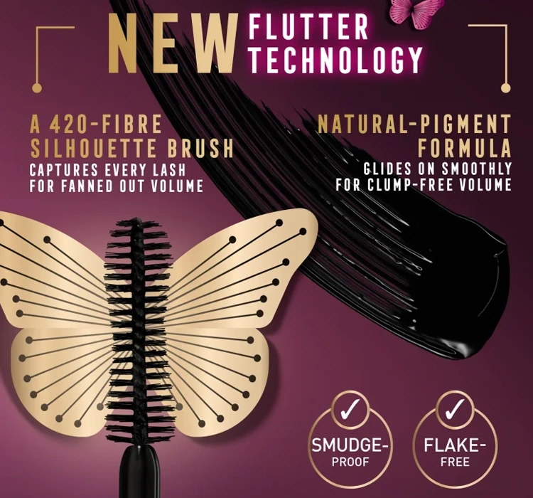 Die Max Factor Masterpiece Divine Lashes Volume Mascara verlängert die Wimpern maximal und verleiht ihnen maximale Fülle. Dies verdankt sie der speziell geformten Bürste mit 420 Fasern und der innovativen Flutter-Technologie. Die Mascara 001 Rich Black vergrößert den Augenradius um bis zu 156 %. Außerdem entstehen keine Klumpen, und sie ist wischfest.
