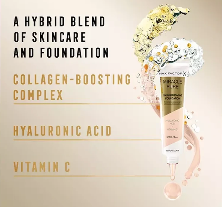 Max Factor Miracle Pure Skin-Improving Foundation ist die erste Foundation der Marke, die die Hautbeschaffenheit verbessert. Ihre Formel enthält einen Collagen-Boosting-Komplex, Vitamin C und Hyaluronsäure, wodurch der Kosmetikartikel die Hautpflege unterstützt. Die Rezeptur der Miracle Pure Foundation wurde ebenfalls mit UVA/UVB-Filtern und SPF30PA+++ Filtern angereichert, die die Haut vor schädlicher Sonneneinstrahlung, Photoalterung und externen Faktoren schützen.