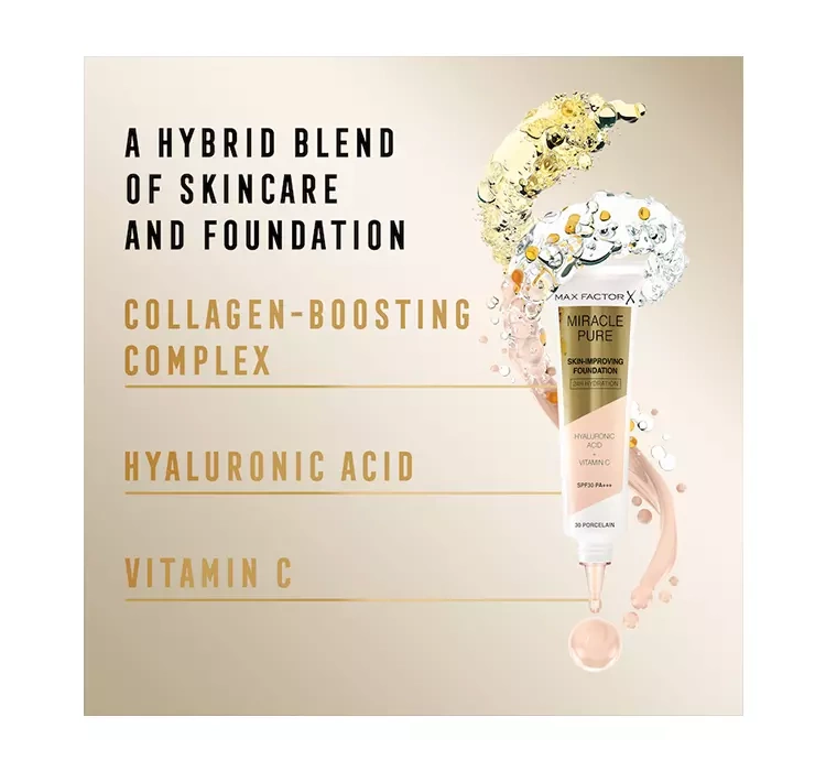 Max Factor Miracle Pure Skin-Improving Foundation ist die erste Foundation im Angebot der Marke, die den Zustand der Haut verbessert. Ihre Formel enthält den Collagen Boosting-Komplex, Vitamin C und Hyaluronsäure, wodurch das Kosmetikum die Hautpflege unterstützt. Die Formel der Miracle Pure Foundation wurde außerdem mit UVA / UVB-Filtern und dem SPF30PA +++ -Filter angereichert, die die Haut vor schädlicher Sonnenstrahlung, Lichtalterung und äußeren Faktoren schützen.