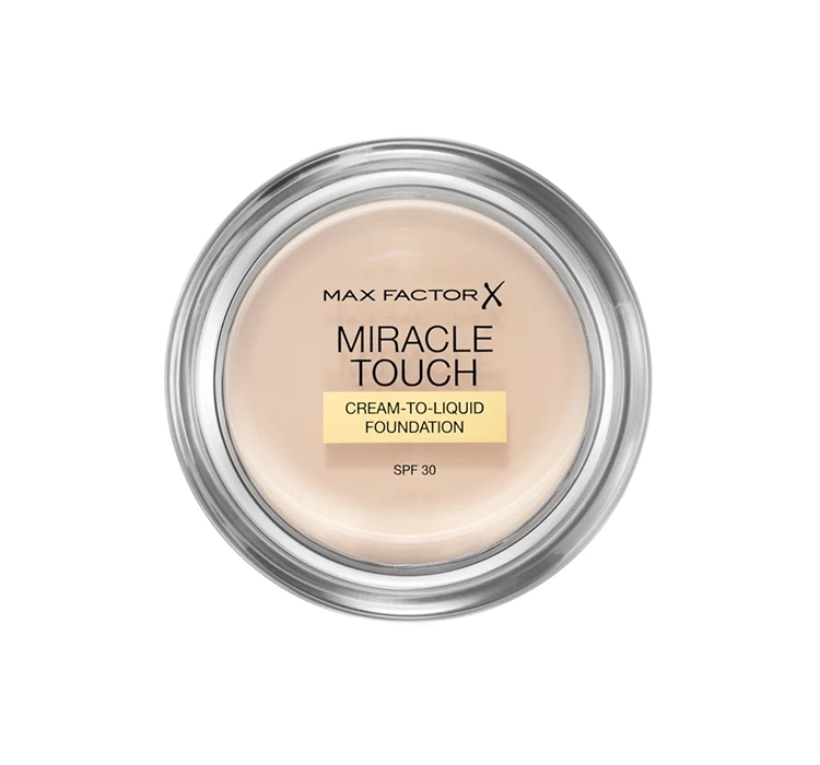 Die Kompaktgrundierung Miracle Touch Cream To Liquid Foundation von Max Factor vereinheitlicht den Hautton, deckt effektiv feine Linien und Falten ab und minimiert die Sichtbarkeit von Poren. Sie hat feuchtigkeitsspendende Eigenschaften dank des Zusatzes von Hyaluronsäure und durch ihre cremige Konsistenz betont sie keine trockenen Stellen. Sie sieht auf der Haut wunderschön aus und verleiht ein samtig mattes Finish. Das Kosmetikprodukt hat eine außergewöhnlich leichte Formel – die cremige Konsistenz verwandelt sich bei Kontakt mit der Haut in eine flüssige Foundation, was die Arbeit und das Verblenden erleichtert. Ein echtes Cream-to-Liquid von der Marke Max Factor.