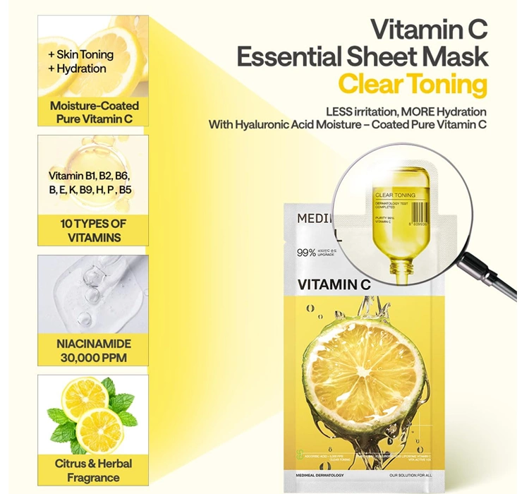 Die Formel der Mediheal Vitamin C Gesichtsmaske wurde für eine umfassende Pflege von glanzloser Haut entwickelt. Die mit der Maske getränkte Essenz enthält eine konzentrierte Mischung aktiver Inhaltsstoffe – Vitamin C, Niacinamid, Sanddornextrakt und Panthenol. Vitamin C ist ein starker Antioxidans, der Pigmentflecken aufhellt und Anzeichen von Müdigkeit bekämpft. Niacinamid gleicht den Teint aus und verbessert die Elastizität, während Sanddorn die Schutzbarriere der Haut stärkt und ihr ein gesundes Aussehen verleiht. Panthenol wirkt beruhigend und spendet intensive Feuchtigkeit, um Austrocknung zu verhindern. Die Kombination dieser Inhaltsstoffe sorgt für sofortige Beruhigung und Frische.