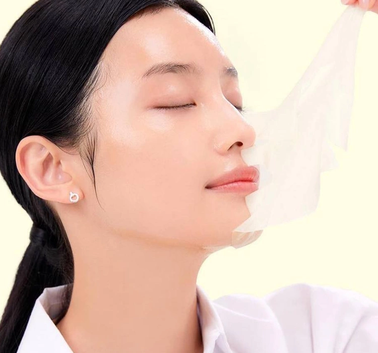Legen Sie das Maskentuch auf die gereinigte Gesichtshaut, beginnend an der Stirn, über die Wangen bis zum Kinn. Strecken Sie es in Richtung Ohren und passen Sie es genau an. Drücken Sie den restlichen Essenzinhalt aus der Verpackung aus und massieren Sie ihn in Hals und Dekolleté ein. Nach ca. 10–20 Minuten das Tuch abnehmen und die verbleibende Essenz sanft in die Haut einklopfen. Genießen Sie glatte und strahlende Haut!