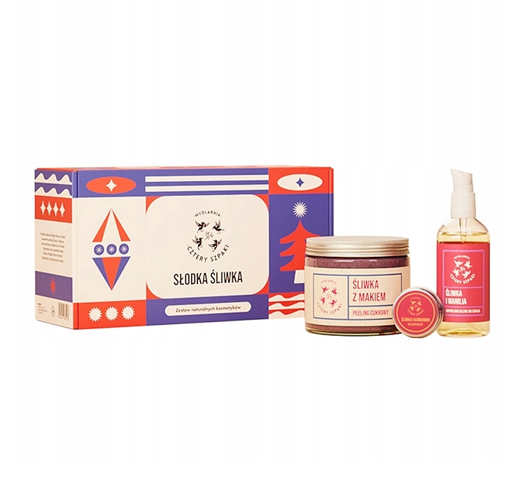 Mydlarnia Cztery Szpaki Geschenkset mit Naturkosmetik Süße Pflaume Zuckerpeeling 250 ml + Körperöl 100 ml + Lippenbalsam 15 ml