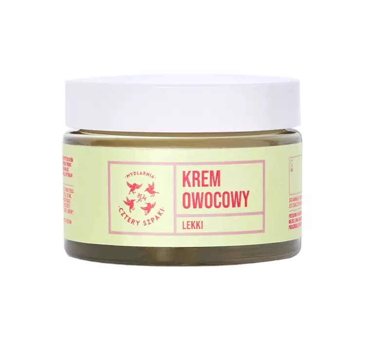 Die leichte Fruchtcreme von Mydlarnia Cztery Szpaki ist eine natürliche Pflege für das Gesicht, die wie eine Vitaminbombe wirkt. Sie ist mit einer sorgfältig ausgewählten Mischung gefüllt, die reich an stark antioxidativen und freien Radikalen bekämpfenden Inhaltsstoffen ist. Dazu gehören unter anderem Öle aus Pfirsichkernen, Himbeeren, Johannisbeeren, Erdbeeren und Äpfeln sowie Extrakte aus Äpfeln, Erdbeeren und Himbeeren. Diese wirken auf die Haut revitalisierend, nährend und aufhellend. Sie bringen ein junges, gesundes und erholtes Aussehen zurück, damit Sie sich in jeder Situation schön fühlen. Die Creme ist ideal für die tägliche Anwendung, in der Morgenpflege, auch unter dem Make-up.