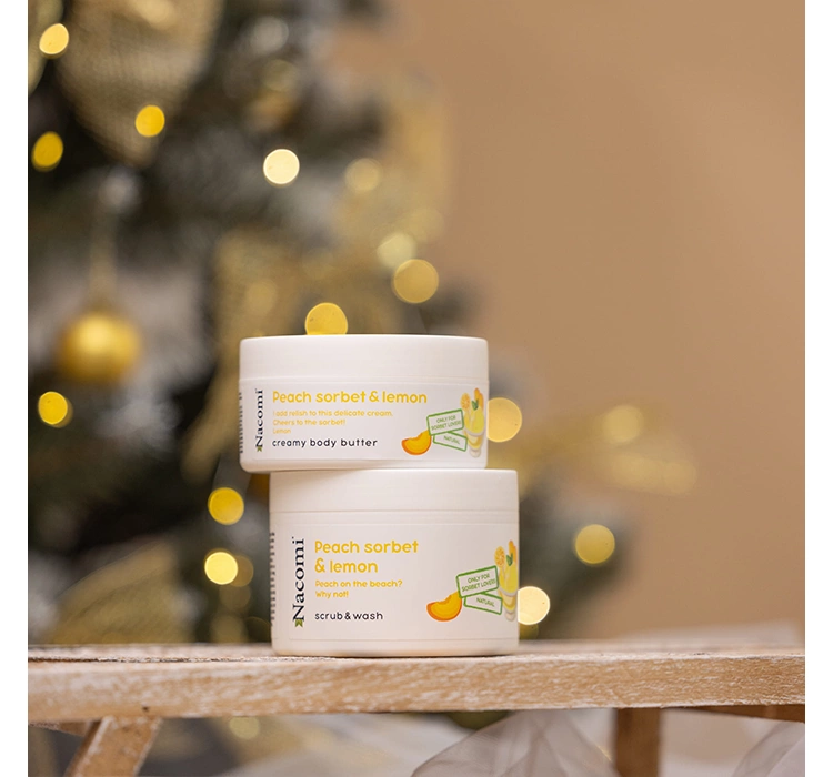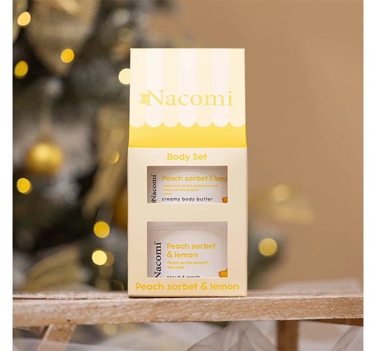 PolenDas Nacomi Peach Sorbet & Lemon Set enthält eine cremige Körperbutter und ein Körperpeeling mit einem außergewöhnlichen Duft von Pfirsichsorbet und saftiger Zitrone. Weihnachten ist eine Zeit, in der jeder von uns entspannen möchte, und die Kosmetikprodukte im Geschenkset helfen Ihnen, eine wunderbare SPA-Atmosphäre zu Hause zu schaffen.