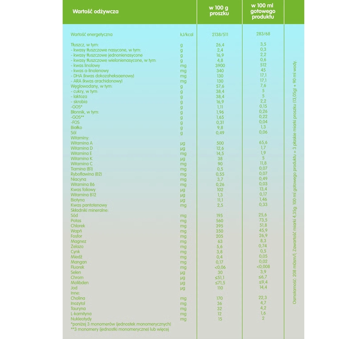 Zutaten: Laktose (aus Milch), pflanzliche Öle (Sonnenblume, Raps), Kartoffelstärke (18 %), Galaktooligosaccharide (GOS) (aus Milch) (6,2 %), teilweise hydrolysierte: Molkenproteinisolat (aus Milch) und Molkenproteinkonzentrat (aus Milch), Kaliumphosphat, Calciumcitrat, Magnesiumchlorid, Cholinbitartrat, Fruktooligosaccharide (FOS) (0,3 %), Öl aus Mortierella alpina, Mikroalgenöl (Schizochytrium sp.), L-Arginin, Kaliumchlorid, Natriumchlorid, Vitamin C (Natrium-L-ascorbat), L-Histidin, L-Phenylalanin, Taurin, Kulturen von Lactobacillus reuteri*, Inositol, Eisen(II)-sulfat, Calciumphosphat, Nukleotide, L-Carnitin, Zinksulfat, Vitamin E (DL-α-Tocopherolacetat), Niacin (Nicotinamid), Pantothensäure (Calciumpantothenat), Kupfersulfat, Vitamin A (Retinylacetat), Vitamin B1 (Thiaminmononitrat), Vitamin B2 (Riboflavin), Vitamin B6 (Pyridoxinhydrochlorid), Mangansulfat, Kaliumjodid, Folsäure, Natriumselenat, Vitamin K (Phyllochinon), Vitamin D (Cholecalciferol), Biotin, Vitamin B12 (Cyanocobalamin).