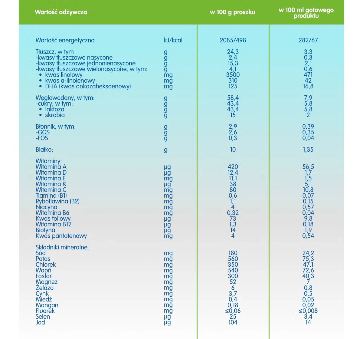 Zutaten: Magermilch, pflanzliche Öle (Sonnenblumenöl, Rapsöl), Kartoffelstärke, demineralisierte Molke (aus Milch), Laktose (aus Milch), Molkenpermeat (aus Milch), Galaktooligosaccharide (aus Milch), Calciumcitrat, Maisstärke, Fischöl, Kaliumcitrat, Emulgator: Lecithine (aus Soja), Calciumphosphat, Fruktooligosaccharide (FOS), Magnesiumchlorid, Vitamine (C, E, Niacin, Pantothensäure, B1, B2, A, B6, Folsäure, K, D, Biotin, B12), Natriumcitrat, Natriumchlorid, Eisensulfat, Antioxidationsmittel (Tocopherolmischung, L-Ascorbylpalmitat), Zinksulfat, Bakterienkultur Limosilactobacillus reuteri*, Kupfersulfat, Mangansulfat, Kaliumjodid, Natriumselenat.