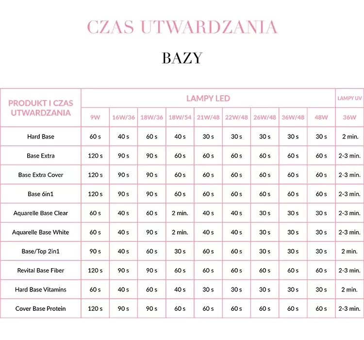 - Primer auf die vorbereitete Nagelplatte auftragen, dann eine dünne Schicht der Cover Base Protein auftragen, in der LED- oder UV-Lampe gemäß Tabelle aushärten.