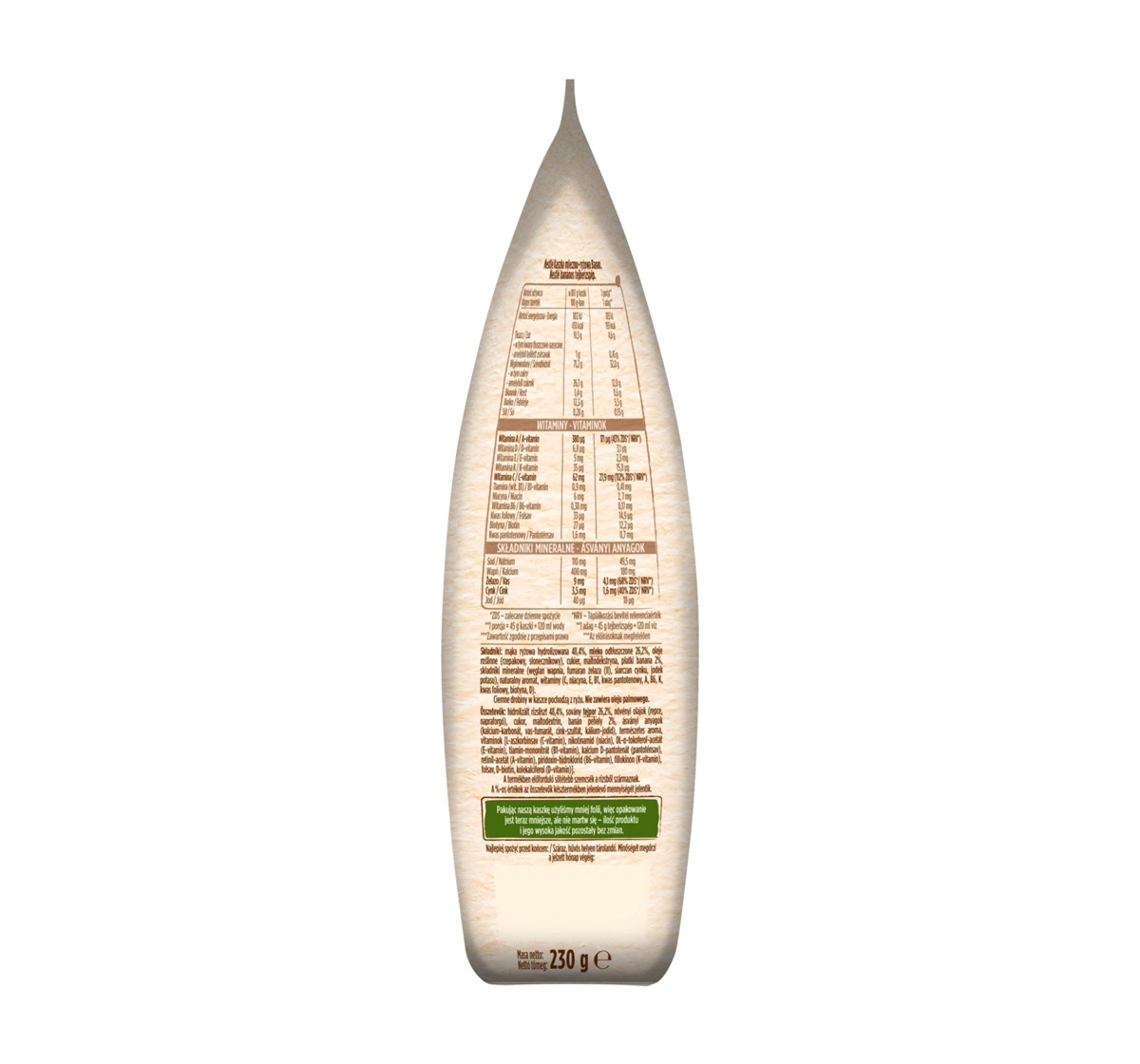 Ingredients / Inhaltsstoffe: hydrolysierte Reismehl 48,4%, Magermilch 26,2%, pflanzliche Öle (Raps, Sonnenblume), Zucker, Maltodextrin, Bananenflocken 2%, Mineralstoffe (Calciumcarbonat, Eisen(II)-fumarat, Zinksulfat, Kaliumjodid), natürliches Aroma, Vitamine (C, Niacin, E, B1, Pantothensäure, A, B6, K, Folsäure, Biotin, D).