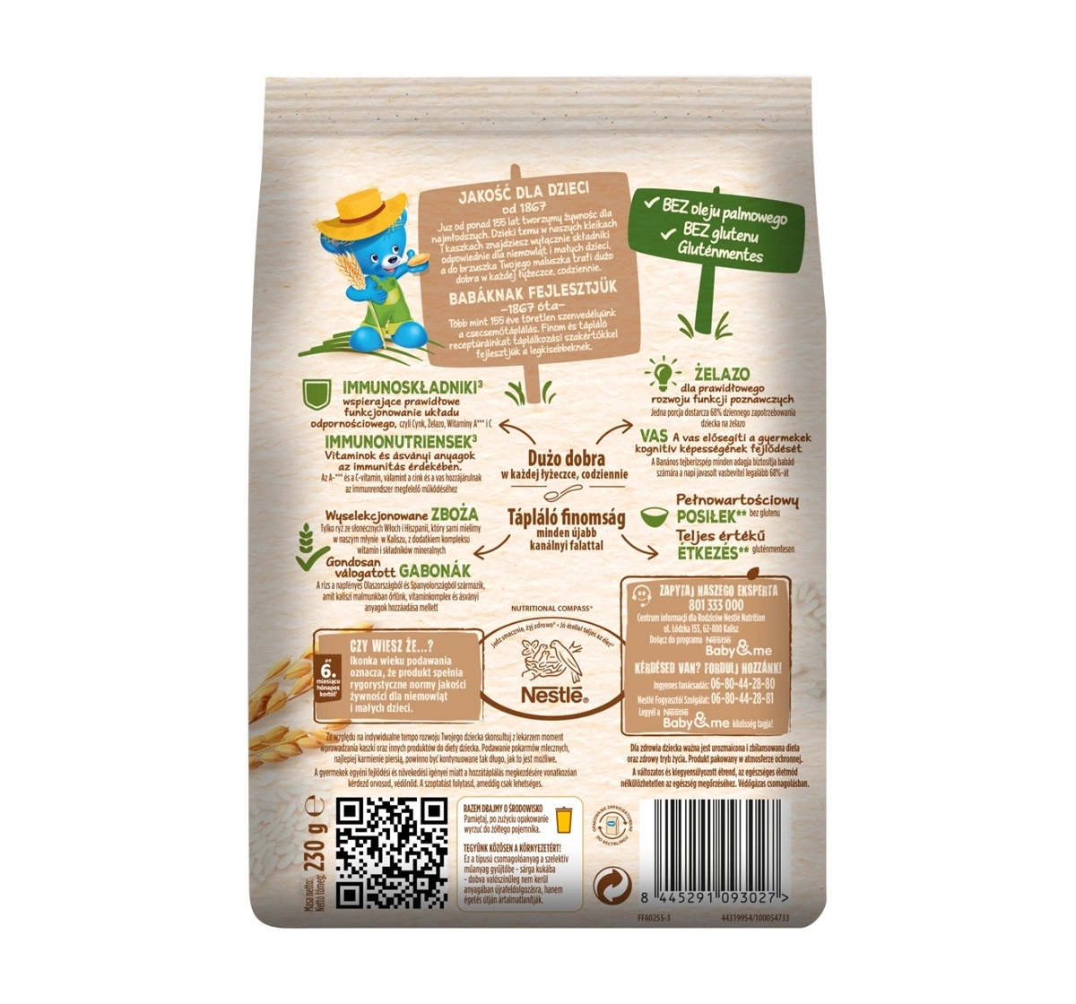 Die Formel des Nestlé Milch-Reisbreis ist mit wichtigen Immunstoffen wie Eisen, Zink sowie Vitamin A und C angereichert, die die normale Funktion des Immunsystems unterstützen, sowie Eisen für die gesunde Entwicklung kognitiver Funktionen.