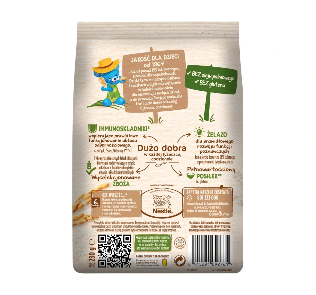 Die Formel Nestlé Milch-Reisbrei wurde mit essenziellen Nährstoffen wie Eisen, Vitamin D und Bifidus BL Bakterienkulturen angereichert, die die Knochenentwicklung, das Immunsystem und die normale Funktion des Verdauungssystems unterstützen. Das Produkt enthält ausschließlich natürlich vorkommende Zucker und leicht verdauliche Zutaten, wodurch es sich ideal für das empfindliche Verdauungssystem eines Säuglings eignet.