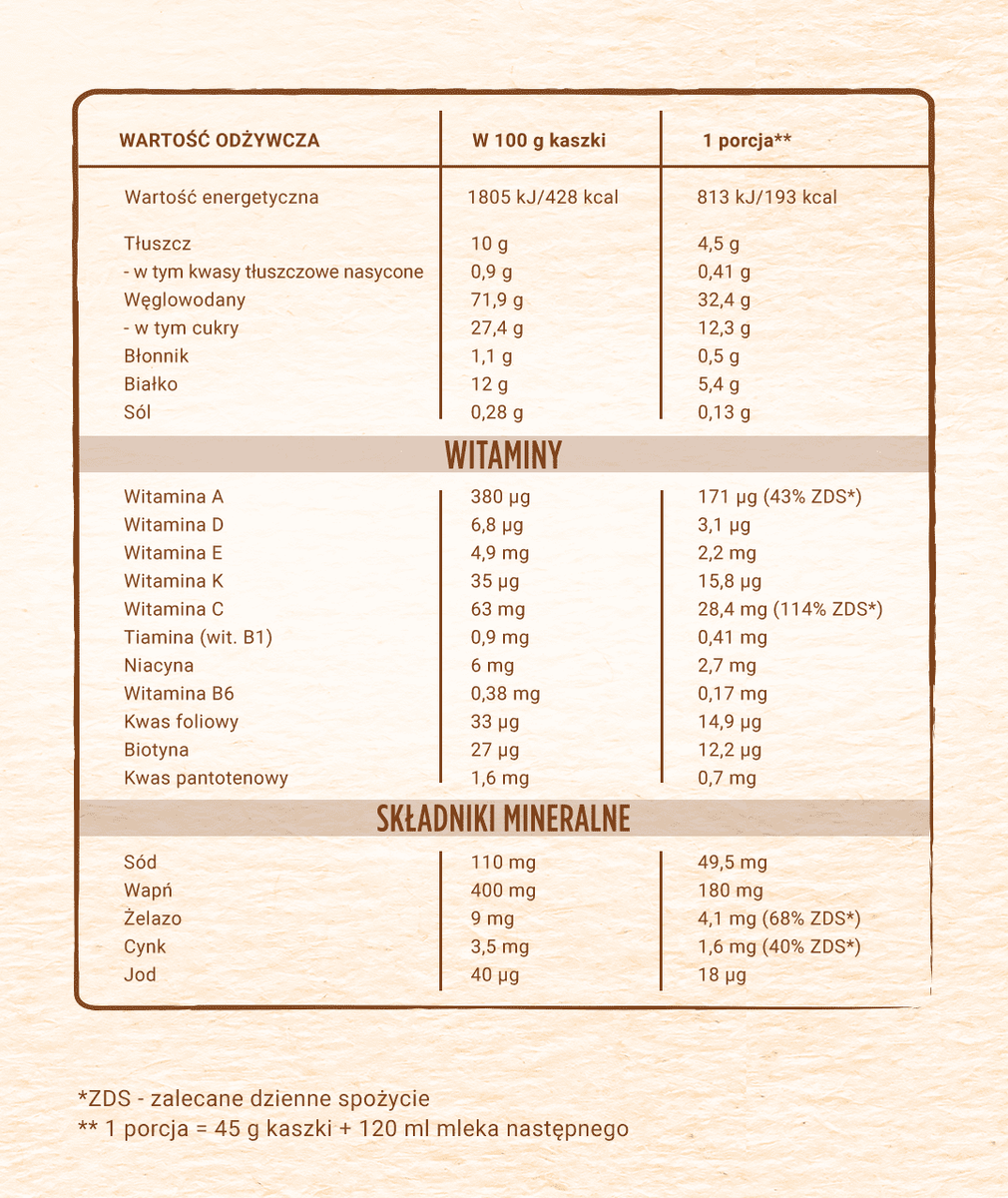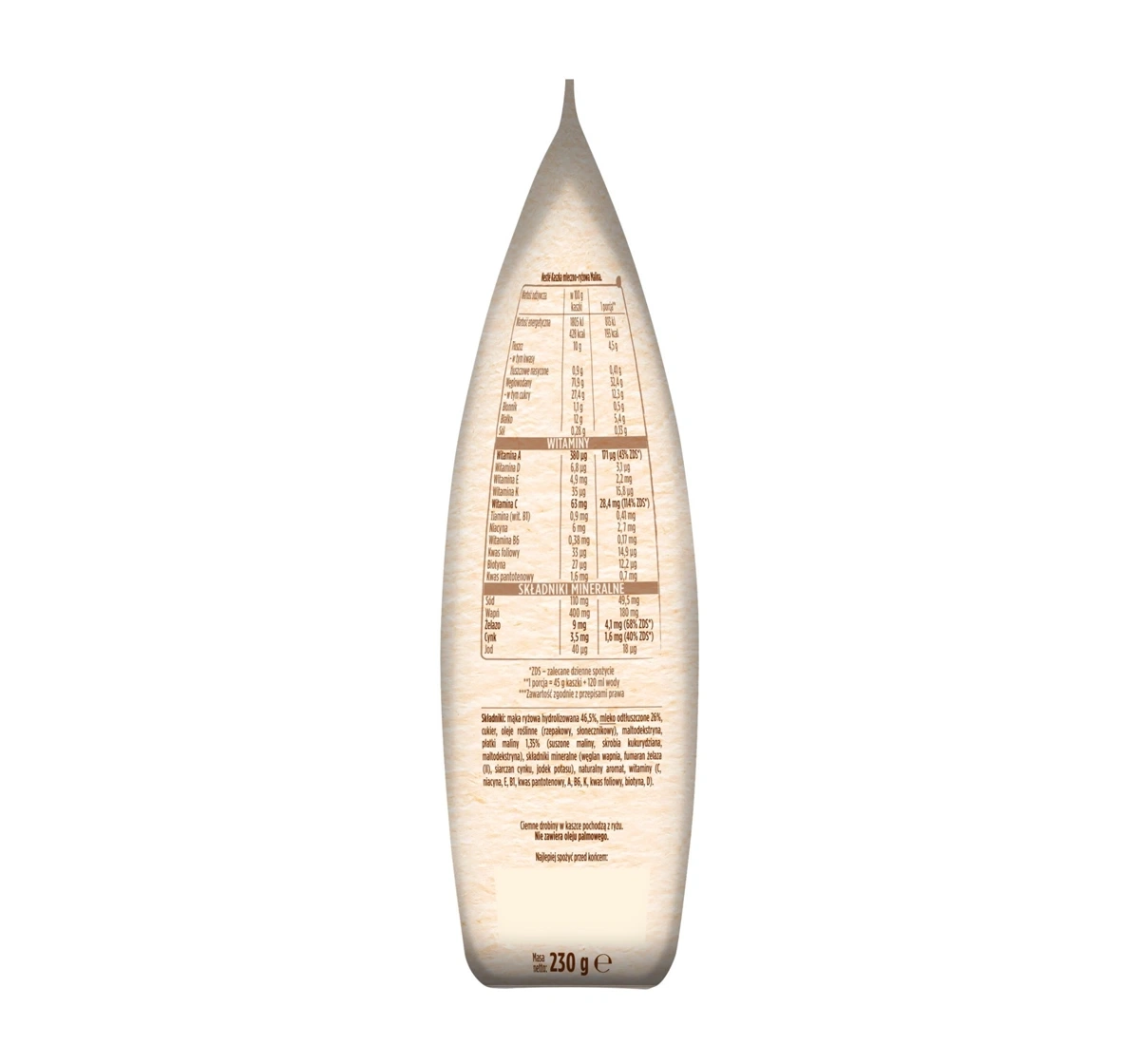 Ingredients: hydrolysiertes Reismehl 46,5%, Magermilch 26%, Zucker, pflanzliche Öle (Rapsöl, Sonnenblumenöl), Maltodextrin, Himbeerflocken 1,35% (getrocknete Himbeeren, Maisstärke, Maltodextrin), Mineralstoffe (Calciumcarbonat, Eisen(II)-fumarat, Zinksulfat, Kaliumjodid), natürliches Aroma, Vitamine (C, Niacin, E, B1, Pantothensäure, A, B6, K, Folsäure, Biotin, D). Dunkle Partikel im Brei stammen vom Reis. Die Verpackung enthält 5 Portionen einer vollwertigen Getreide-Milch-Mahlzeit.