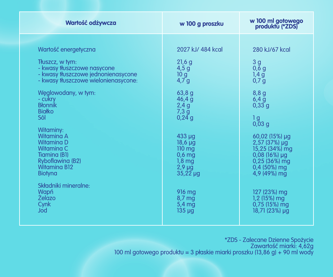 Ingredients: Vollmilch (48%), Magermilch (25%), Maltodextrin, Laktose (aus Milch), pflanzliche Öle (Rapsöl, Sonnenblumenöl), Molkenpermeat (aus Milch), Galaktooligosaccharide (GOS) (aus Milch), Calciumsitrat, Säureregulator (Kaliumphosphate), Emulgator [Lecithine (aus Soja)], Calciumcarbonat, Fruktooligosaccharide (FOS), Vitamine (C, B2, B1, A, Biotin, D, B12), Eisen(II)-sulfat, Zinksulfat, Antioxidantien (Mischung aus Tocopherolen, Ascorbylpalmitat), Kaliumjodid.