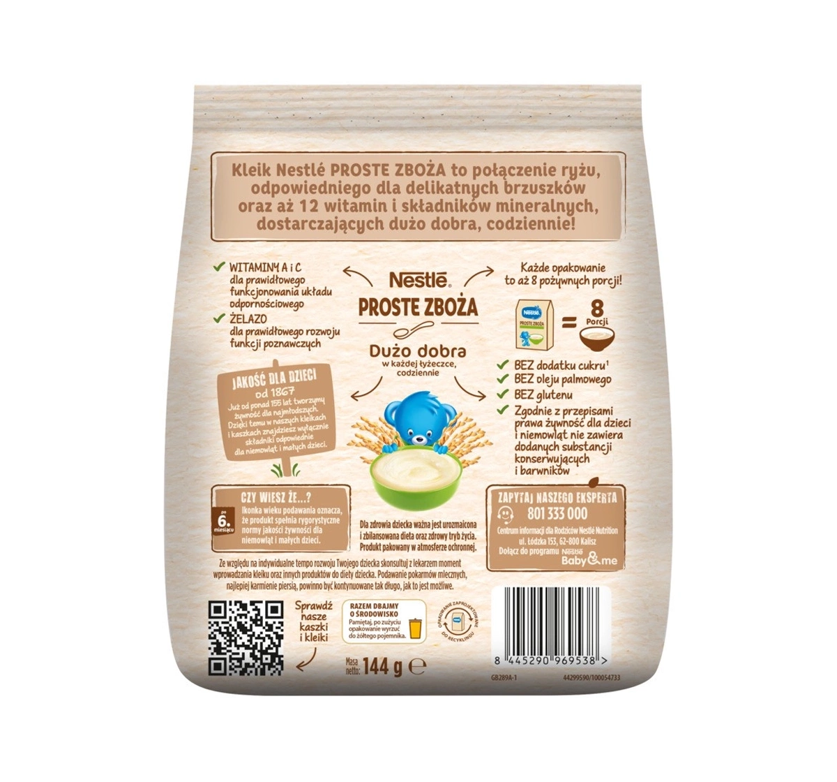 Die Formel des Nestlé Proste Zboża Reisbreis enthält 12 Vitamine und Mineralstoffe, darunter die Vitamine A und C, die das Immunsystem unterstützen, sowie Eisen, das für die kognitive Entwicklung wichtig ist. Der Brei ist frei von Zuckerzusatz, Palmöl und Gluten, was ihn zu einer sicheren und gesunden Wahl für Kinder macht. Außerdem enthält er, gemäß den gesetzlichen Vorschriften, keine Konservierungsstoffe oder künstliche Farbstoffe, was für höchste Qualität der Mahlzeit sorgt.