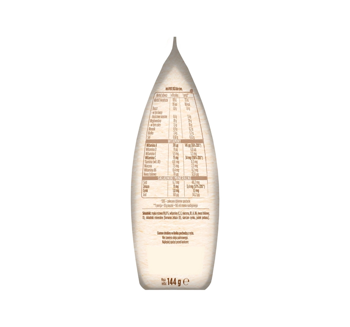 Ingredients: Reisflocken 99,8 %, Vitamine (C, E, Niacin, B1, A, B6, Folsäure, D), Mineralstoffe [Eisen(II)-fumarat, Zinksulfat, Kaliumiodid].