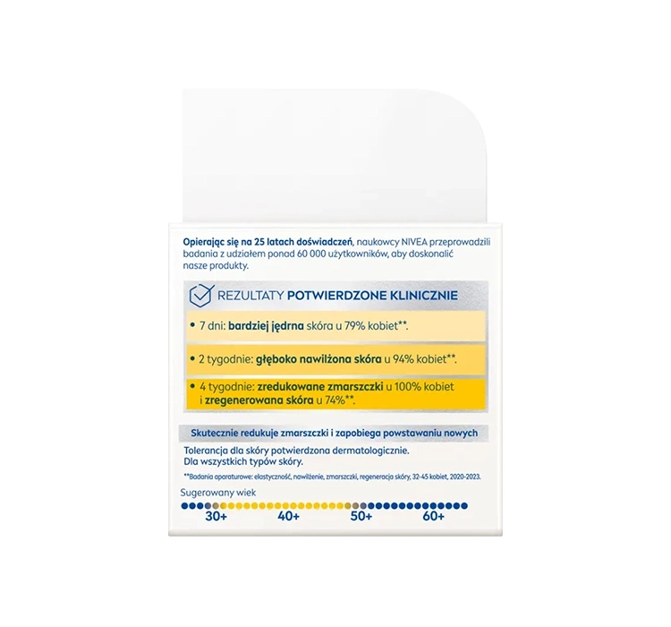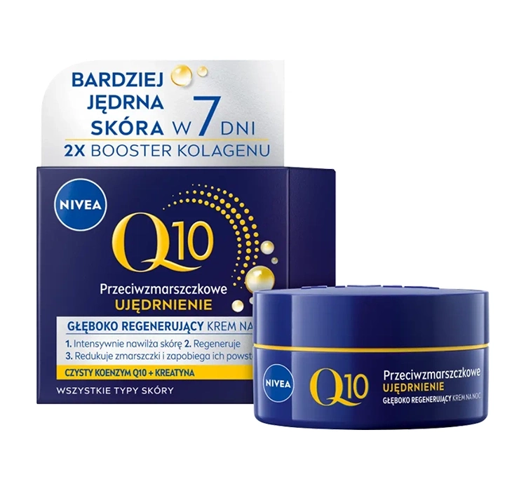 Nivea Q10 ist eine Pflegeserie für reife Haut jeden Typs, ab dem Alter von 50 Jahren. Sie enthalten Antioxidantien, die von Natur aus in der Haut vorkommen. So stimulieren sie die Epidermis, ihren eigenen Energiestoffwechsel zu verbessern, indem sie die Regeneration und Erneuerung unterstützen.
