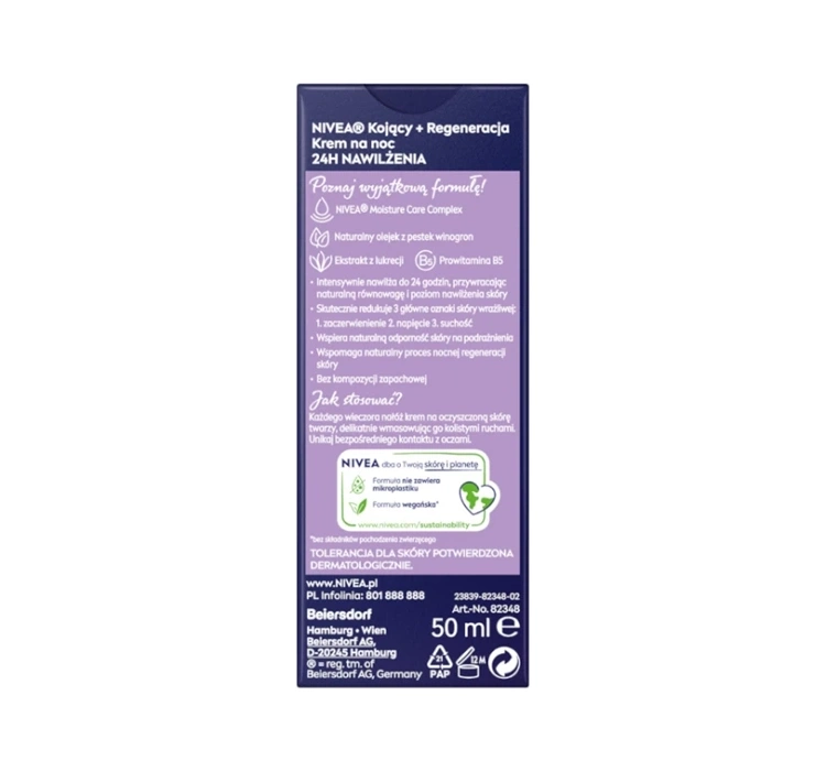 Die beruhigende & regenerierende Nachtcreme hat eine angenehme Konsistenz, die sich leicht auf der Haut verteilen lässt. Die Hautverträglichkeit ist dermatologisch bestätigt. NIVEA kümmert sich um deine Haut und den Planeten. Die vegane Formel enthält kein Mikroplastik – nur das Beste für deine Haut!