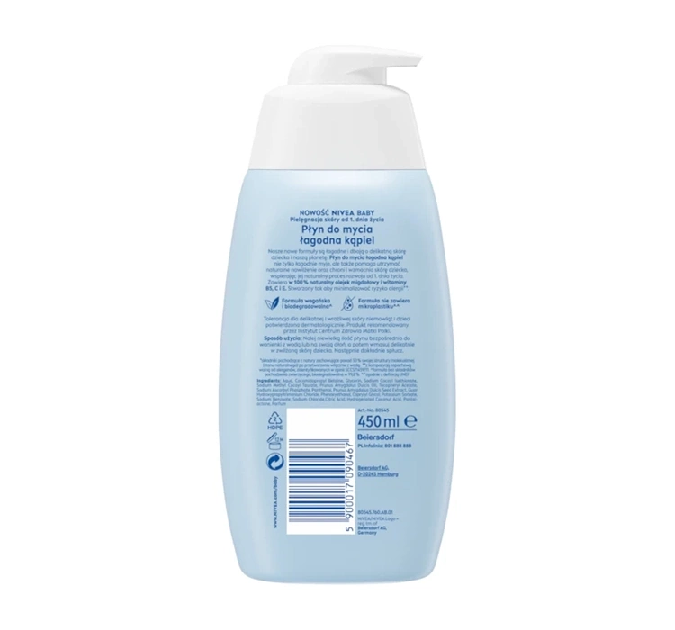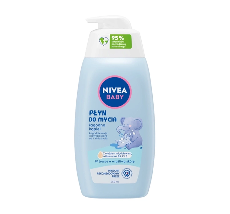 Das Waschgel von Nivea Baby ab dem 1. Lebenstag ist ein vom Institut Zentrum für die Gesundheit der Mutter Polin empfohlenes Produkt, und seine Verträglichkeit für die empfindliche und sensible Haut von Säuglingen und Kindern ist dermatologisch bestätigt. Die Formeln der Nivea Baby Serie sind sanft und pflegen die empfindliche Haut des Kindes und unseren Planeten. Die Formel ist vegan, biologisch abbaubar^ und enthält kein Mikroplastik^^. Das Waschgel wurde aus 95% natürlichen Inhaltsstoffen hergestellt**.