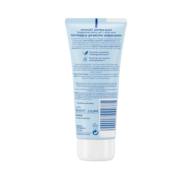 12 Monate nach ÖffnungCreme gegen Windeldermatitis von Nivea Baby fettet, befeuchtet und nährt die Haut angemessen, unterstützt den natürlichen Entwicklungsprozess der Haut ab dem 1. Lebenstag. Dank der dichten, reichhaltigen Konsistenz schützt die Creme von Nivea Baby die Haut, indem sie unangenehme Reibungen in der Beuge der Beine oder Arme, im Windelbereich oder zwischen den Hautfalten verhindert. Die Creme bietet dem Kind Beruhigung und dem Elternteil die Sicherheit, dass das Wohlbefinden seines Schützlings vollständig gewährleistet ist. Die Formel wird durch natürliche Inhaltsstoffe wie Mandelöl und die Vitamine B5 und E unterstützt.