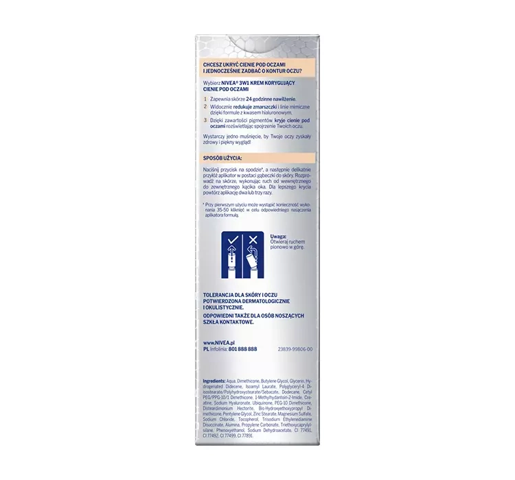 Die 3-in-1 Augenringe korrigierende Creme aus der Nivea Cellular Hyaluron Filler Serie versorgt die Haut nicht nur umfassend, sondern eignet sich auch perfekt für das tägliche Make-up. Dieses äußerst wirksame Kosmetikum hat eine stark feuchtigkeitsspendende, faltenhemmende und korrigierende Wirkung. Die innovative Formel enthält wertvolle Hyaluronsäure, die die Haut bis zu 24 Stunden tief mit Feuchtigkeit versorgt und gleichzeitig die Sichtbarkeit von Falten und Mimikfältchen reduziert. Die in der Zusammensetzung enthaltenen Pigmente kaschieren problemlos alle Unreinheiten, Anzeichen von Müdigkeit und dunkle Augenringe und hinterlassen eine strahlende und wunderbar strahlende Haut. Die Creme gleicht die Farbe perfekt aus und stellt ihr schönes, gesundes und jugendliches Aussehen wieder her. Perfekt für alle Hauttypen, auch für empfindliche.