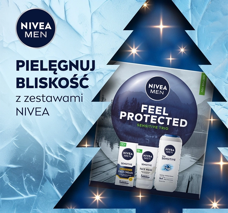 • Das NIVEA MEN Feel Protected Weihnachts-Set für Männer enthält Kosmetika aus der NIVEA MEN Sensitive Linie, die für Komfort, Feuchtigkeit und Beruhigung der empfindlichsten Gesichts- und Körperhaut sorgen.
