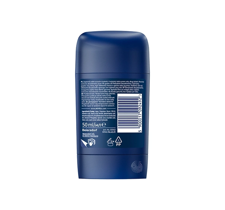Entdecke die langanhaltende Frische und eliminiere unangenehme Gerüche mit dem Deodorant-Stick NIVEA MEN Fresh Active, der schnell einzieht und gleichzeitig zuverlässigen 48-Stunden-Schutz sowie eine glatte Anwendung bietet. Das Geheimnis liegt in der einzigartigen Formel NIVEA ∞ INFINIFRESH. Dank der antibakteriellen Formel werden die geruchsverursachenden Bakterien effektiv beseitigt. Das Deodorant sorgt für ein Frischegefühl ohne klebrige Haut. Langanhaltendes Gefühl frischer Haut, das länger als nur ein paar Stunden anhält. Hautverträglichkeit dermatologisch bestätigt. Aluminiumfreie Formel. Das Deodorant enthält keinen Ethylalkohol.
