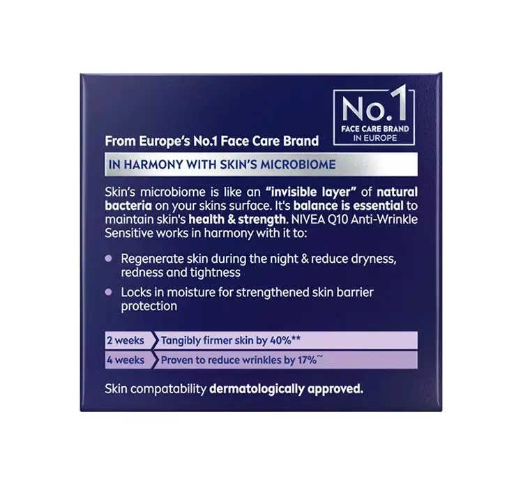 Beruhigende Nachtcreme Q10 Nivea ist zur abendlichen Pflege der gereinigten Gesichtshaut gedacht. Man kann die Kosmetik täglich anwenden, um nach 4 Wochen sichtbare Verbesserung des allgemeinen Hautzustands zu merken. Die zarte Formel sorgt vor allem für sensible Haut bei Frauen zwischen 30 und 50 Jahren.