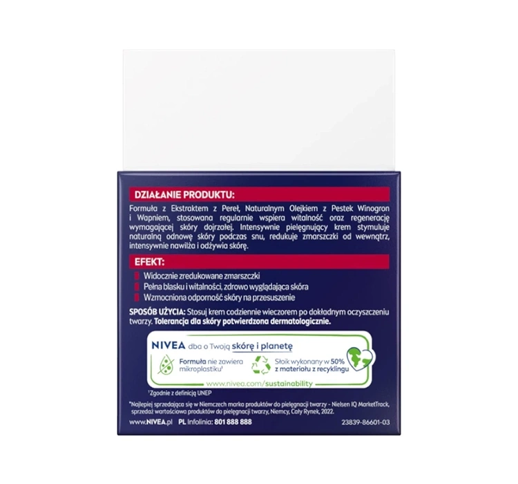 12 Monate nach ÖffnungDie regenerierende Gesichtscreme aus der Nivea Vital Anti-Falten Serie ist das ideale Produkt für die nächtliche Anwendung für reife Haut. Die innovative Formel basiert auf der Wirkung von naturbelassenem Traubenkernöl, Perlenextrakt und Kalzium, die ein breites Wirkungsspektrum haben. Die Creme dringt tief in die Hautschichten ein und nährt sie intensiv, spendet Feuchtigkeit und beruhigt jegliche Irritationen. Wichtig ist, dass die Gesichtscreme vor übermäßiger Austrocknung schützt und der Haut einen schönen Glanz verleiht, was ihr ein gesundes, erholt wirkendes Aussehen zurückgibt. Sie stimuliert auch eine schnellere Regeneration und Erneuerung der Haut während des Schlafs, reduziert sichtbar Falten und feine Linien und hemmt gleichzeitig deren Entstehung. Das Produkt hinterlässt die Haut glatt, samtweich im Griff und voller Komfort sowie natürlichem, jugendlichem Glanz.