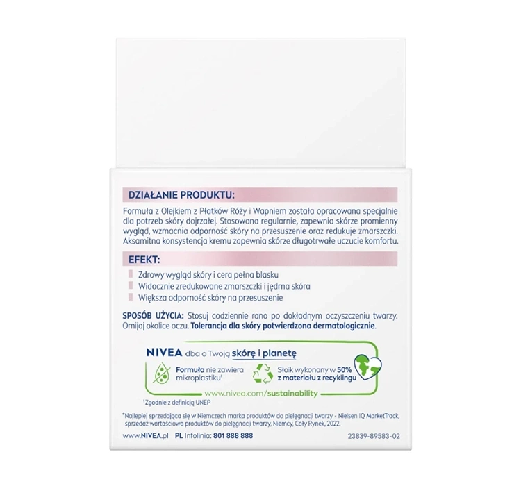 Die Anti-Falten-Tagescreme Nivea Vital für reife Haut ist ein Kosmetikprodukt, das Du jeden Tag verwenden kannst, sobald Du aufstehst und Dein Gesicht zum ersten Mal reinigst. Seine erprobte Anti-Ageing-Wirkung basiert auf einer Kombination aus pflegenden Wirkstoffen, darunter Rosenblütenöl und dem Zusatz einer wertvollen Calciumquelle. Gemeinsam schützen sie die Epidermis, indem sie eine zarte Schicht über ihr bilden, der Trockenheit und eine erhöhte Verdunstung von Feuchtigkeit verhindert. Auf diese Weise wird das Gesicht angenehm gestrafft und erhält mehr Elastizität, Zartheit und einen strahlenden Glanz, der der Haut Vitalität verleiht.