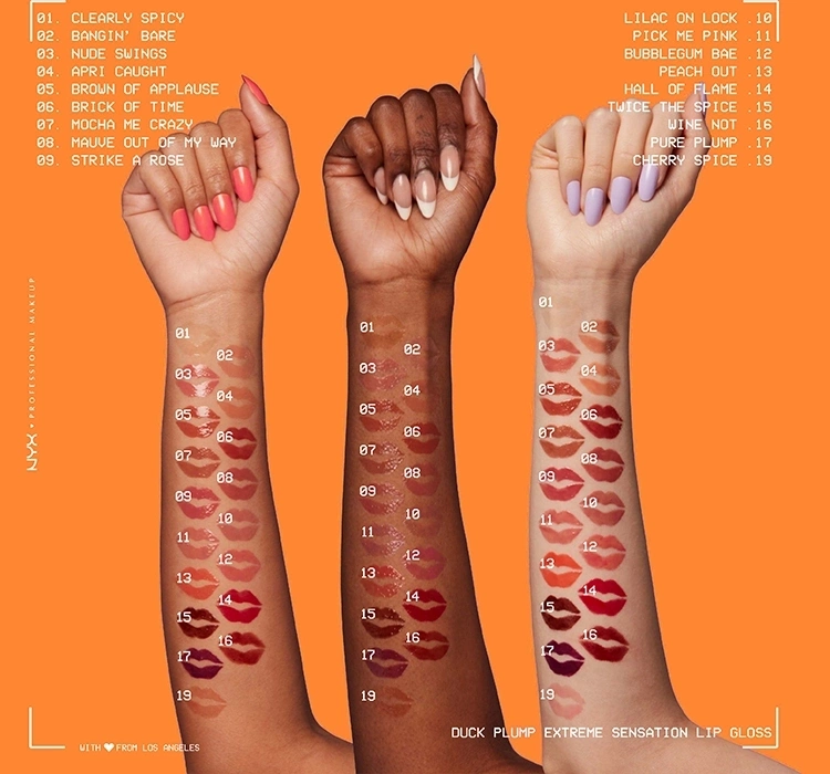 Die Marke NYX Professional Makeup weiß, wie wichtig die Auswahl des richtigen Farbtons und ein inklusiver Ansatz gegenüber den Kunden sind. Daher ist Duck Plumping Lip Gloss in 18 Farbvarianten erhältlich, darunter 2 transparente und 16 intensiv pigmentierte. Jede Person wird etwas Passendes finden, unabhängig von Anlass oder Stimmung.