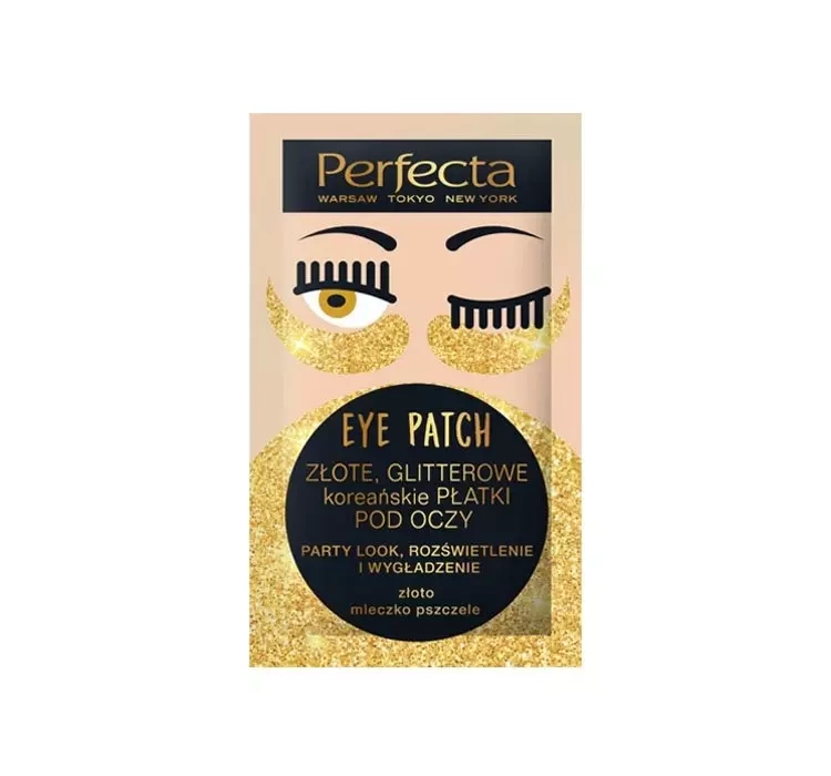 Goldene, koreanische Glitterpads unter Augen von Perfecta straffen die Haut, glätten und bringen sie zart zum Strahlen sowie hellen die dezente gegend rund um die Augen auf.