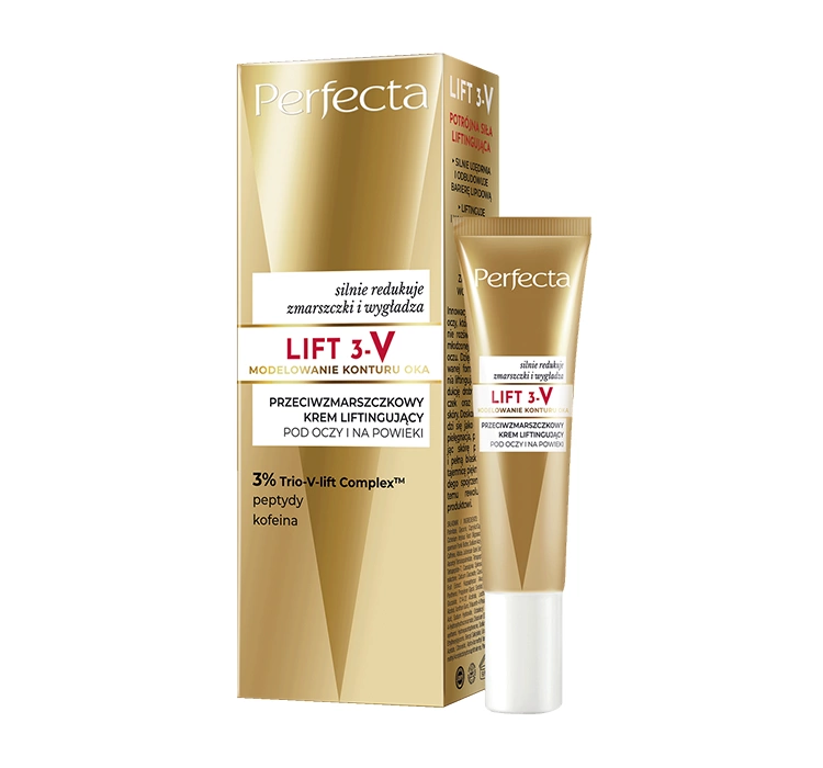 Anti-Falten-Lifting-Augen- und Augenlidcreme Perfecta Lift 3-V ist ein innovatives Produkt, das die zarte Haut intensiv regeneriert. Dank der fortschrittlichen Formel spendet die Augencreme Perfecta Lift 3-V intensive Feuchtigkeit, reduziert feine Linien und sorgt für einen Lifting-Effekt, der die Konturen der Augen sofort verbessert. Die tägliche Anwendung der Creme mit Koffein und Vitamin C Perfecta Lift 3-V sorgt für eine strahlende, verjüngte Haut mit Glow.