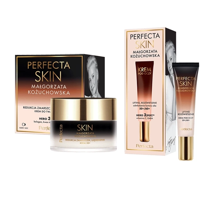 • Perfecta Małgorzata Kożuchowska Geschenkset für die Gesichtspflege ist ein Komplett-Set für reife Haut, bestehend aus der Gesichtscreme 50+ und der Augencreme 50+/60+. Es befeuchtet intensiv, glättet und verbessert die Hautelastizität.