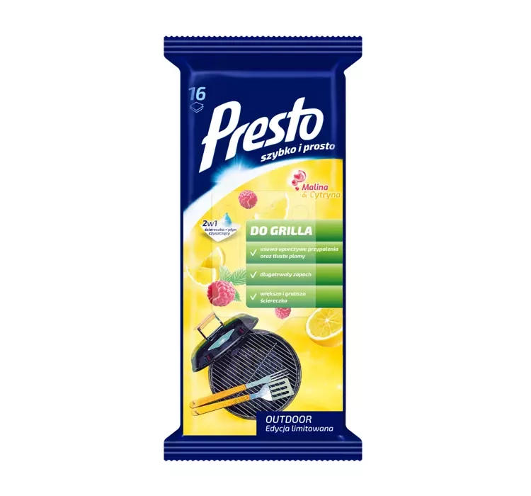 Die Feuchttücher von Presto sind eine hervorragende Möglichkeit, schnell und angenehm zu reinigen. Die einzigartige Zusammensetzung der Reinigungssubstanzen ermöglicht es, dass die Tücher problemlos Verunreinigungen aller Art entfernen und so langanhaltende Sauberkeit, Frische und Glanz gewährleisten. Die Tücher für die Reinigung von Grills, Rosten, Keramikplatten und Öfen entfernen effektiv Verbranntes und fettige Flecken. Sie hinterlassen einen angenehmen, himbeer-zitronigen Duft, ohne die Haut der Hände zu reizen.
