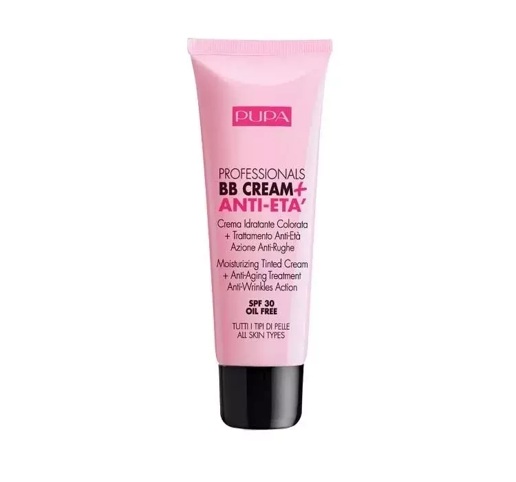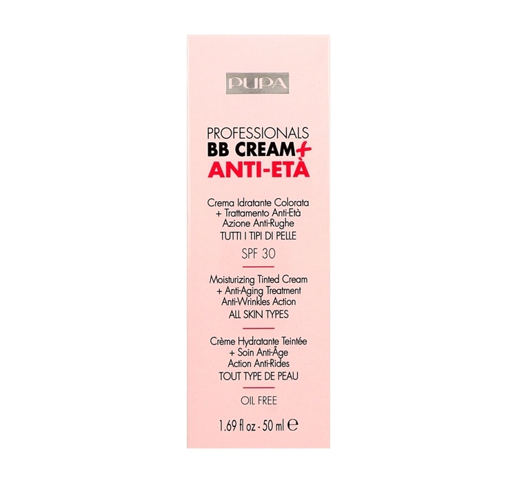 Pupa Professionals BB Cream + Anti Eta SPF 30 ist eine BB Ctreme mit Anti-Falten-Wirkung. Kleine Linien und Falten werden optisch geglättet. Für jeden Hauttyp. Ölfreie Formel, mit SPF 30.
