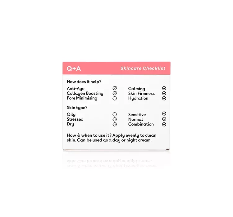 Der Anti-Aging-Gesichtscreme Q+A Collagen Anti-Age Face Cream hat eine angenehm cremige Konsistenz, die sie ideal für die Anwendung tagsüber bei allen Hauttypen macht. Auch unter Make-up geeignet. Besonders empfohlen für reife, ermüdete Haut mit verminderter Elastizität und sichtbaren Falten. Die Q+A Collagen-Creme hat eine effektive glättende und straffende Wirkung dank wertvoller Peptide, die aus Algen gewonnen werden. Diese verleihen der Haut ein jugendliches, frisches Aussehen und heben sanft das Gesichtskontur. Sie werden unterstützt durch Magnesium-PCA, Sheabutter, Extrakt aus japanischem Geißblatt und eine kleine Menge Milchsäure. Alkoholfreie Formel.