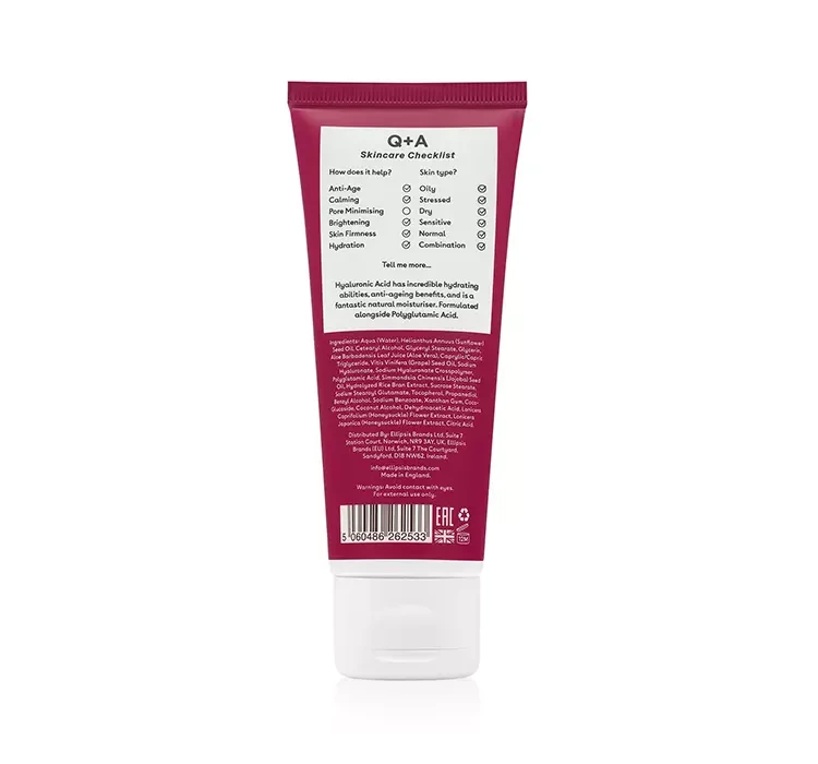 Feuchtigkeitsspendende Gesichtscreme mit Hyaluronsäure Q+A Hyaluronic Acid Daily Moisturiser ist für alle Hauttypen geeignet, insbesondere für trockene, dehydrierte oder reife Haut. Sie kann in die tägliche Pflegeroutine integriert werden, sowohl morgens als auch abends. Die universell pflegende Creme von Q+A sollte immer auf gereinigte Haut aufgetragen werden, gegebenenfalls nach einem Serum, z.B. aus der Q+A Hyaluronic Acid Serie. Sie strafft sichtbar, glättet, macht die Haut weich und hemmt den Alterungsprozess der Haut. Die Creme enthält synergistisch wirkende Säuren – Hyaluronsäure und Polyglutaminsäure, die gemeinsame feuchtigkeitsspendende Eigenschaften haben. Sie bilden eine Schutzbarriere, die den Verlust von wertvollem Wasser aus der Haut verhindert. Sie wurde zusätzlich mit Reiskleie-Extrakt angereichert, der reich an Vitamin E und Antioxidantien ist. Das Gesicht gewinnt an Glätte, Geschmeidigkeit, Feuchtigkeit und einem jugendlichen Aussehen.