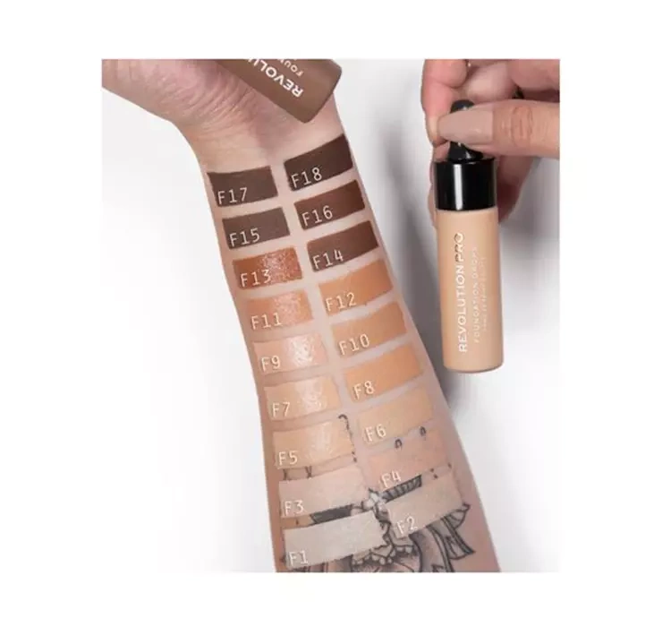 Die breite Farbpalette der Revolution Pro Foundation Drops ermöglicht es Dir, den Farbton perfekt auf Deinen natürlichen Hautton oder Deinen Wunschfarbton abzustimmen. Jede Farbe beginnt mit dem Buchstaben F, gefolgt von einer entsprechenden Zahl zwischen 0,5 und 18. Das bedeutet, dass Du bis zu 19 individuelle Vorschläge zur Auswahl hast! Die Nummern sind chronologisch angeordnet, je höher die Nummer, desto dunkler ist die Foundation und eignet sich besser für gebräunte oder dunkelhäutige Menschen.