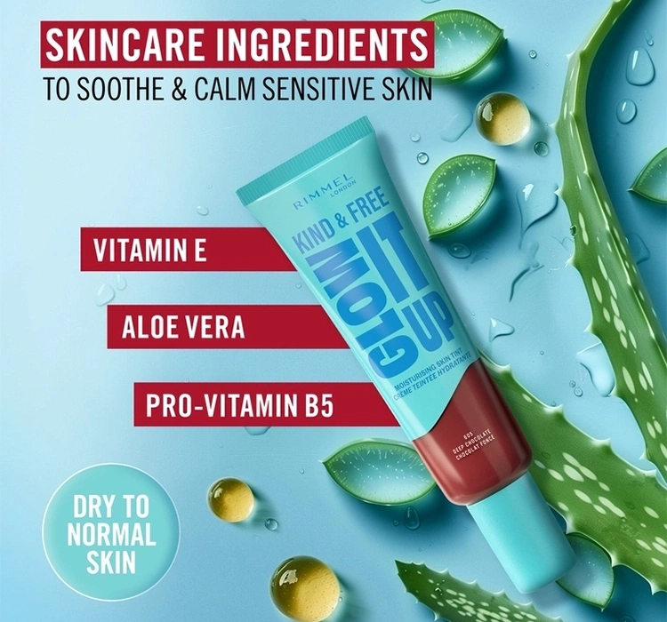 Rimmel Kind & Free Glow It Up Moisturising Skin Tint ist eine leichte, feuchtigkeitsspendende Foundation, die Pflege mit zarter Deckkraft vereint und der Haut einen natürlichen, gesunden Glow verleiht. Entwickelt für empfindliche sowie normale und trockene Haut, beruhigt und spendet sie Feuchtigkeit dank eines antioxidativen Komplexes, der Vitamin E, Pro-Vitamin B5 und Aloe enthält.