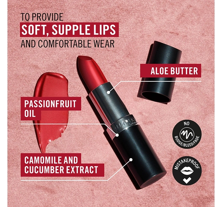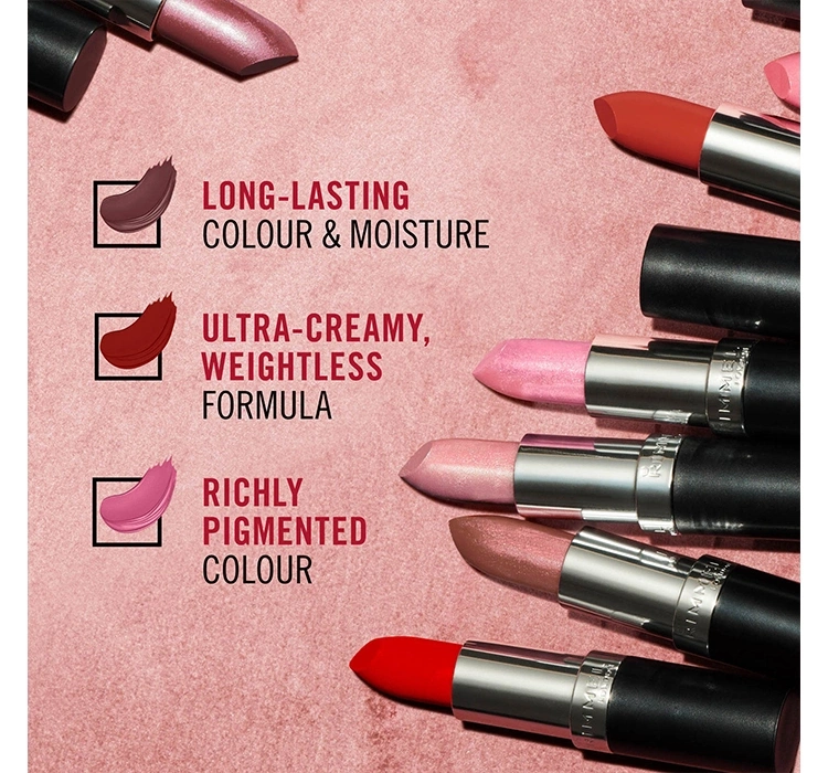 Der satinierte Rimmel Lasting Finish Lippenstift bietet bereits nach einem Auftrag eine sichtbare Farbe. Die vegane Formel ist mit Aloe-Butter, Maracuja-Öl sowie Kamillen- und Gurkenextrakt angereichert, wodurch die Lippen weich, geschmeidig und angenehm befeuchtet werden. Die ultra-cremige, leichte Textur lässt sich leicht auftragen und schmilzt auf den Lippen, wobei sie sie mit einer sichtbaren Farbe und dem gewünschten Finish überzieht. Der Rimmel Lasting Lippenstift wurde entwickelt, um eine Vielzahl von Hauttönen und Schönheitstypen zu ergänzen. Er blättert nicht ab, reißt nicht und bröckelt nicht im Laufe des Tages und sorgt gleichzeitig für sofortige Feuchtigkeit für den ganzen Tag.