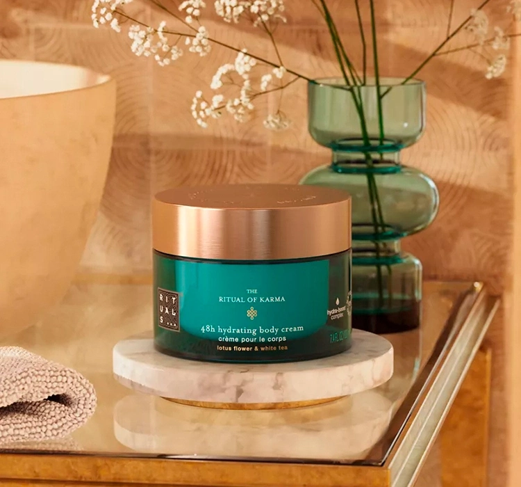 • Die feuchtigkeitsspendende Körpercreme von Rituals The Ritual of Karma spendet tiefen Feuchtigkeit, nährt und glättet die Haut.