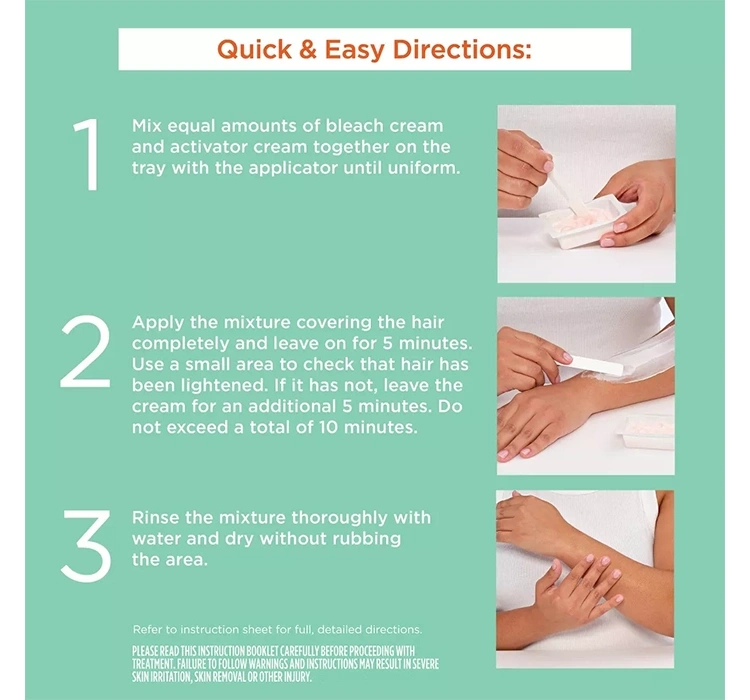 Das Set enthält:aufhellende Creme (Creme Hair Bleach), 45,5 g Aktivator (Activator), 21,2 g Spülung (Pre-Conditioner), 29,5 ml Schüssel Spatel