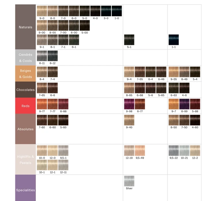 Permanente Colorationscreme. SICHERHEITSANWEISUNGEN: Nur für den professionellen Gebrauch. Haarfärbemittel können starke allergische Reaktionen hervorrufen. Bitte lesen und befolgen Sie die Anweisungen. Nicht geeignet für Personen unter 16 Jahren. Temporäre Tattoos mit schwarzem Henna können das Allergierisiko erhöhen. Haare nicht färben, wenn: – ein Hautausschlag im Gesicht vorhanden ist oder die Kopfhaut empfindlich, gereizt oder verletzt ist, – jemals eine Reaktion auf Haarfärbemittel aufgetreten ist, – in der Vergangenheit eine Reaktion auf ein temporäres Tattoo mit schwarzem Henna aufgetreten ist. Außer Reichweite von Kindern aufbewahren. Enthält: siehe Angaben auf der Verpackung. Augenkontakt vermeiden. Bei Kontakt mit den Augen sofort mit Wasser ausspülen. Nicht zur Färbung von Augenbrauen oder Wimpern verwenden. Nach der Anwendung das Haar gründlich ausspülen. Schutzhandschuhe verwenden.